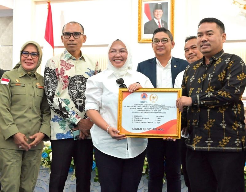 Bupati Touna, Ilham Lawidu diwakili oleh Kepala BPBD Touna, Sigit Labolong menerima langsung bantuan tesebut dalam agenda kunjungan kerja Komisi VIII DPR RI di Ruang Polibu Lantai III Kantor Gubernur Sulawesi Tengah, Kamis (9/4/2026).